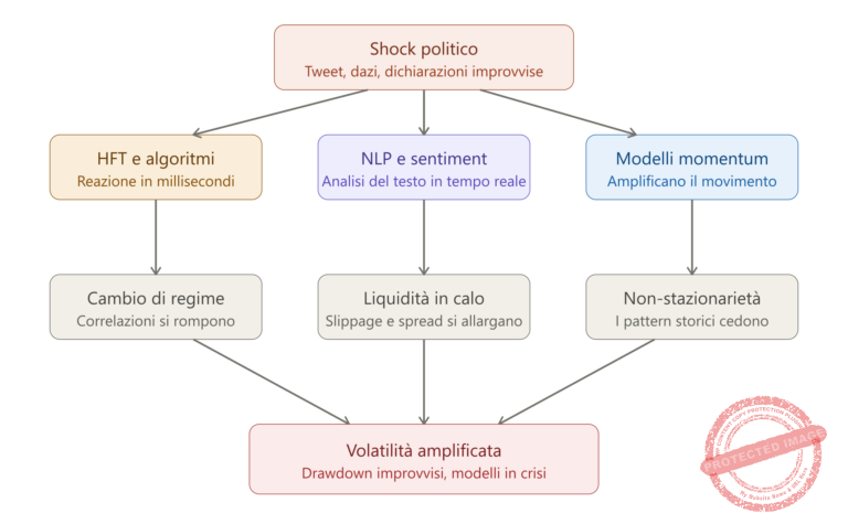 Tre forze si sono combinate per mettere in difficoltà i trading system tradizionali. La prima è la politica entrata nei mercati in tempo reale: tweet, dazi e annunci improvvisi generano shock discreti e imprevedibili che nessuna serie storica può anticipare. La seconda è l’effetto gregge algoritmico: con centinaia di sistemi che leggono le stesse notizie e reagiscono con logiche simili, ogni shock viene amplificato invece che smorzato, e la liquidità scompare nei momenti peggiori. La terza è la fine della stazionarietà : non stiamo attraversando una crisi episodica come il 2008, ma una sequenza continua di micro-shock che impediscono ai modelli di trovare un regime stabile su cui appoggiarsi.